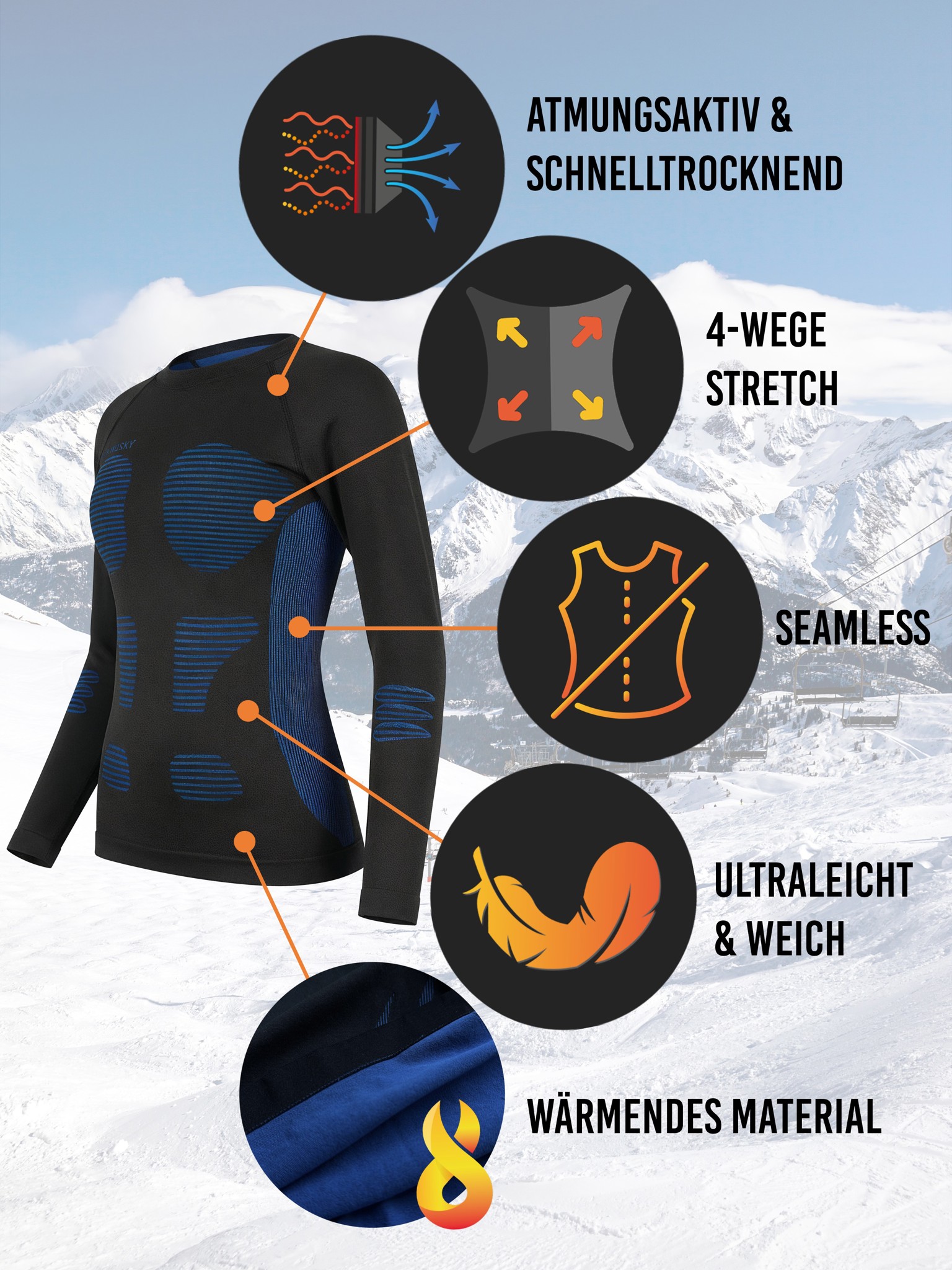 Im Skibereich, auf dem Motorrad oder in der Freizeit ist es nicht nur wichtig, eine atmungsaktive Jacke zu tragen, auch die darunterliegende Unterwäsche spielt eine wichtige Rolle. Denn selbst hochwertige Funktionsbekleidung nützt nichts, wenn sich an der Unterwäsche Feuchtigkeit ansammelt. Die körpernahe Passform und das klimaregulierende, atmungsaktive Material sorgen auch bei körperlicher Anstrengung für guten Feuchtigkeitsabtransport. Entstandener Schweiß oder Nässe werden schnell vom Körper aufgenommen und nach Außen abgegeben. Dieser Prozess lässt die Haut schnell trocknen und sorgt auch bei niedrigen Temperaturen für eine konstante Körperwärme. Somit eignet sich diese Funktionsunterwäsche für jede Jahreszeit.