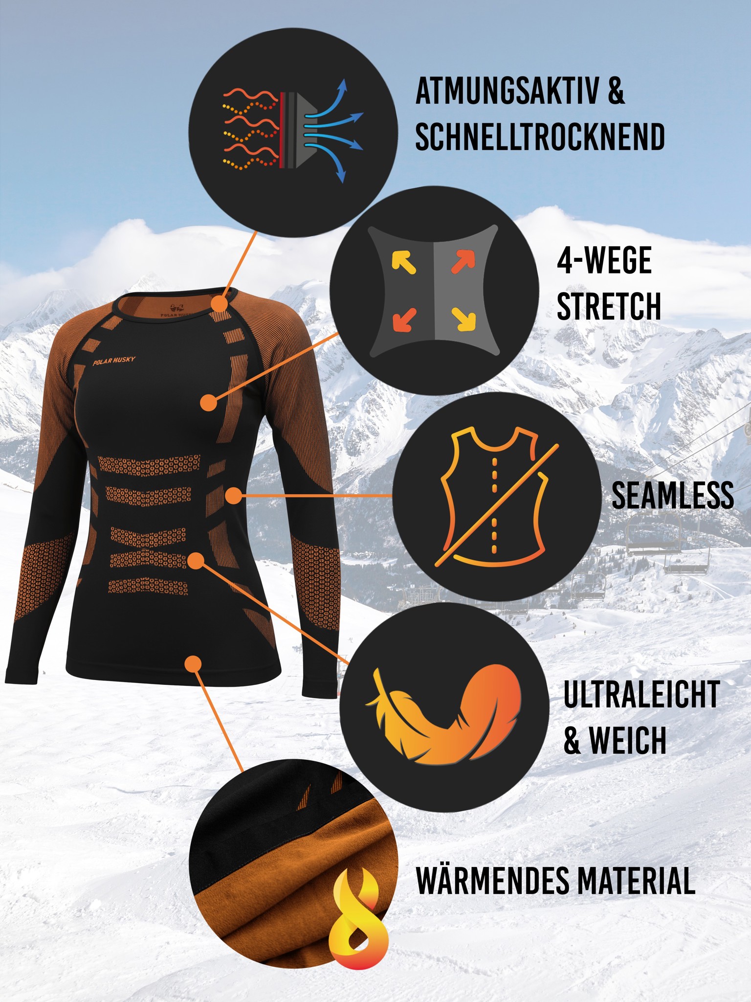 2 x Thermooberteil Langarm Shirt Skiunterwäsche für Damen Orange