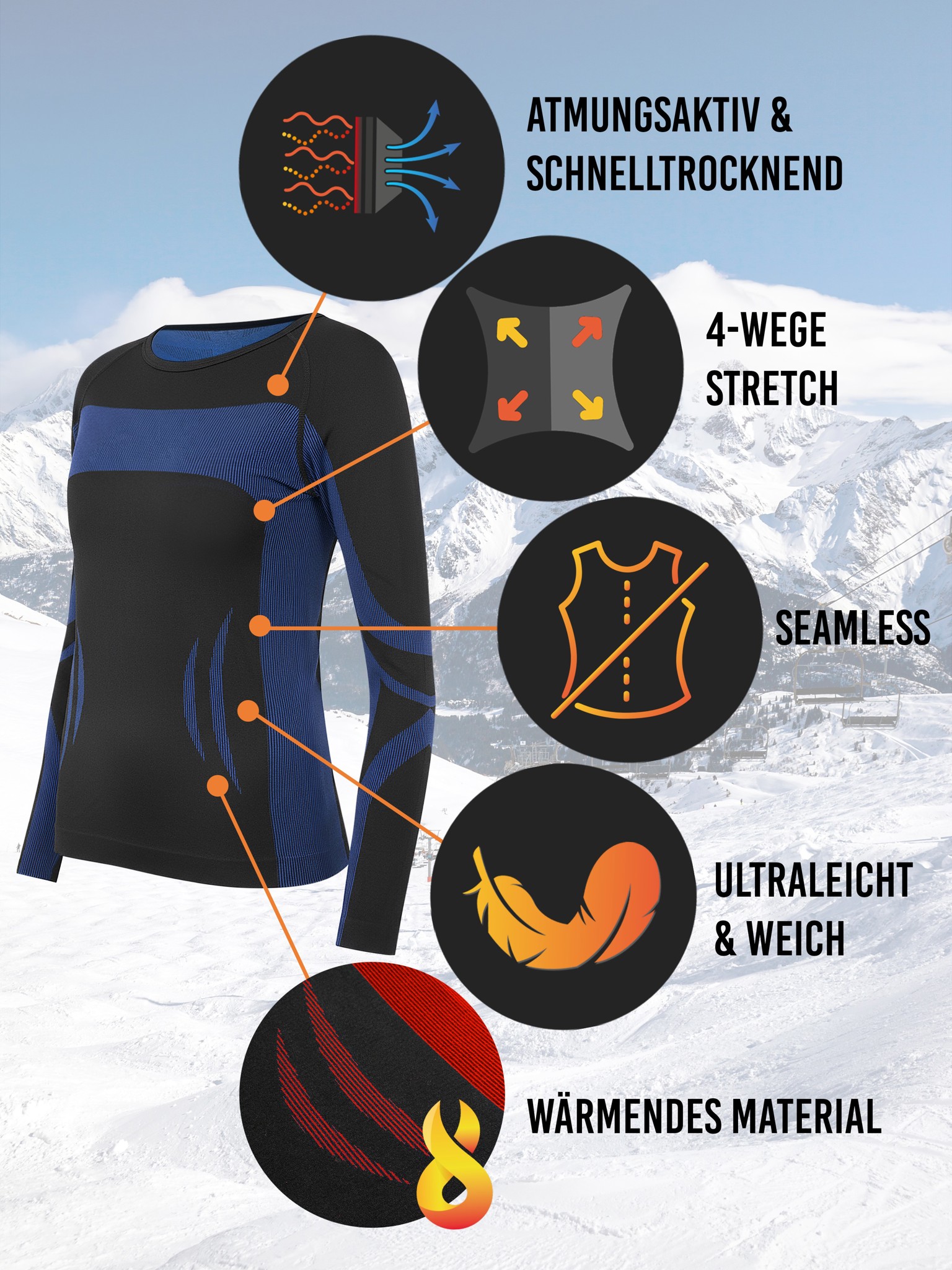 2 x Thermooberteil Langarm Shirt Skiunterwäsche Unisex Schwarz/Rot + Schwarz/Blau