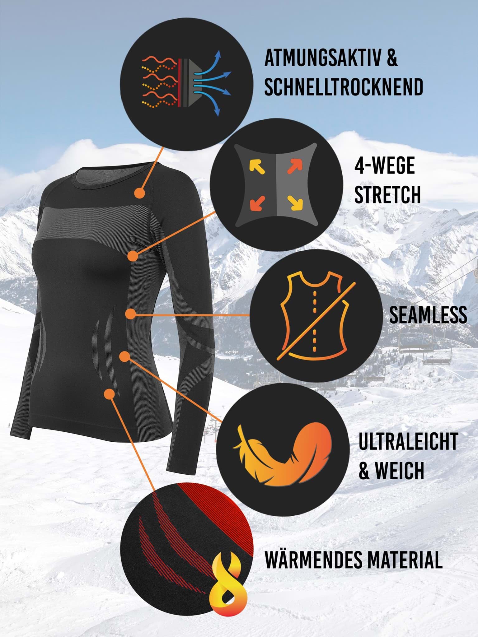 2x Damen Thermooberteil Langarm Shirt Skiunterwäsche Schwarz/Rot