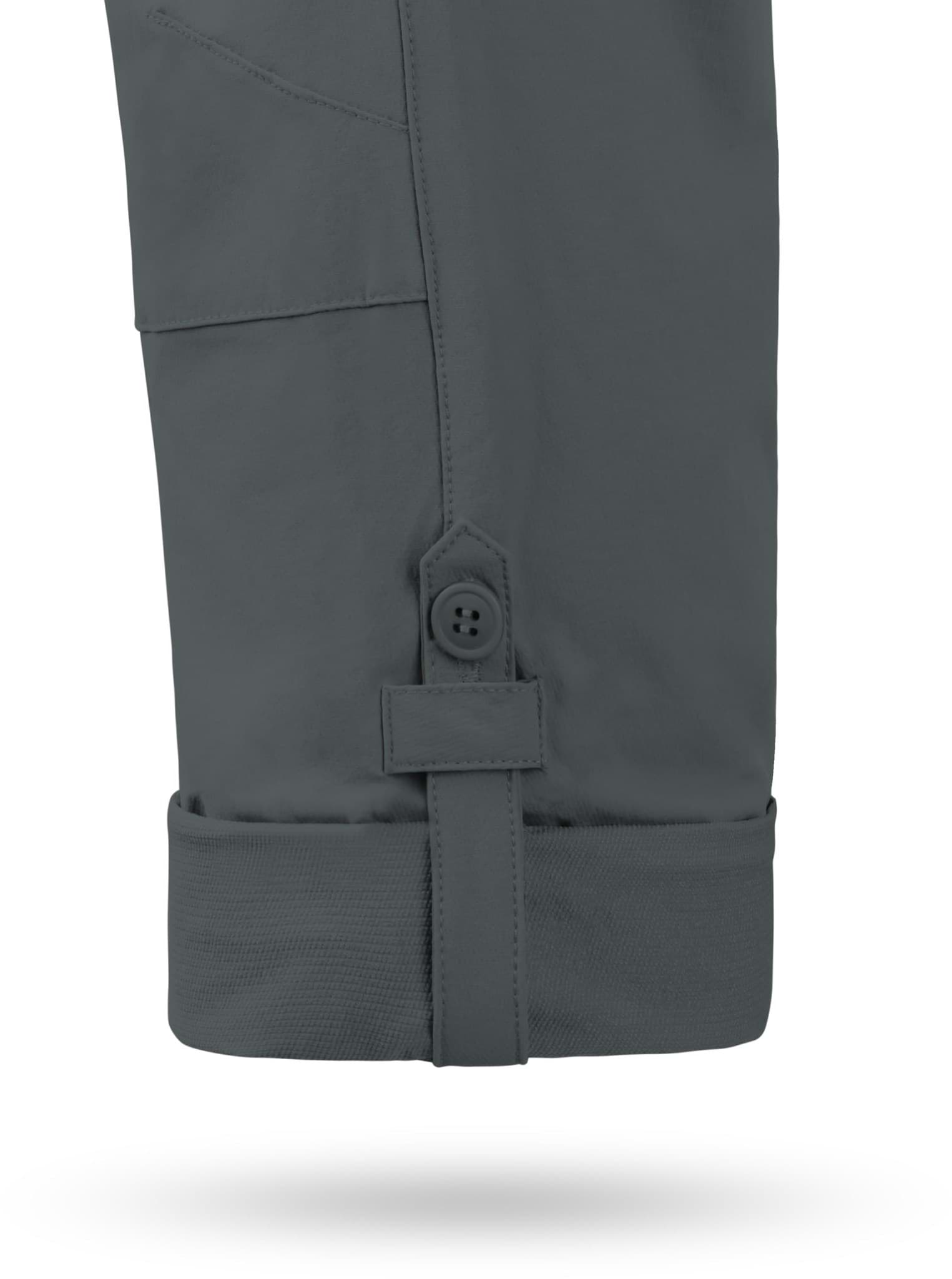 Die Release-Button-Technik, ermöglicht es Ihnen jederzeit die Hosenbeinlänge auf eine 3/4 Länge zu kürzen. Auf Wetterumschwünge oder ansteigende Temperaturen kann so schnell reagiert werden. Dabei wird der untere Stoff ganz einfach hochgekrempelt und per Knopf und Innenlasche fixiert. Im Beinabschluss befindet sich zusätzlich ein Kordelstopper, um die Hose eng an die Schuhe zu ziehen. Für einer verbesserte Passform können auch die zusätzlichen Gürtelschlaufen genutzt werden.
