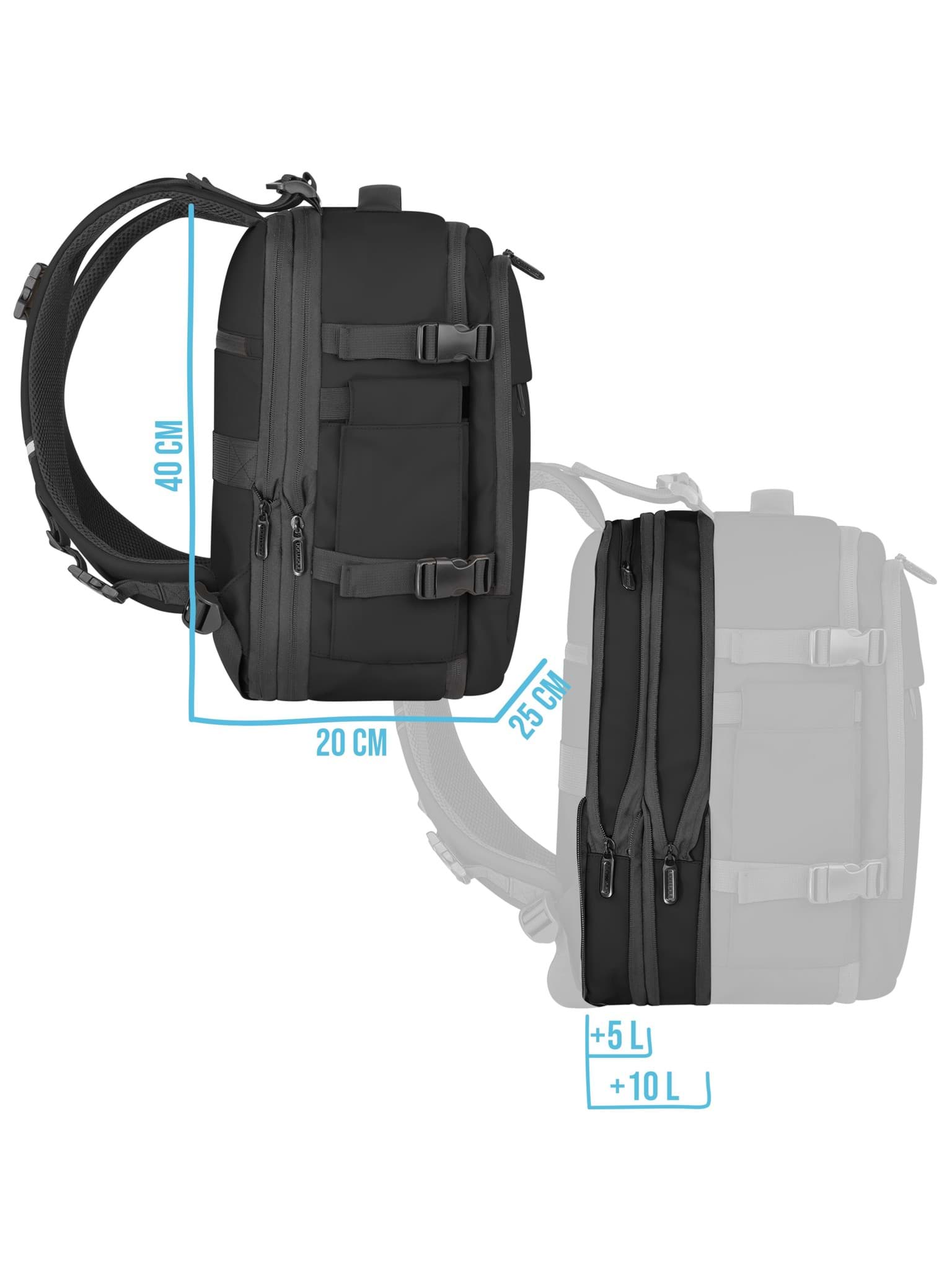• Handgepäck mit Standardmaßen 40x25x20-30 cm • Kabinenrucksack für Ryanair, Wizzair, Easyjet.. • Erweiterbares Volumen von 20 auf 30 Liter • Hochwertiges und schmutzresistentes Material • Reiserucksack mit 6 Fächern + Frontloaderfunktion