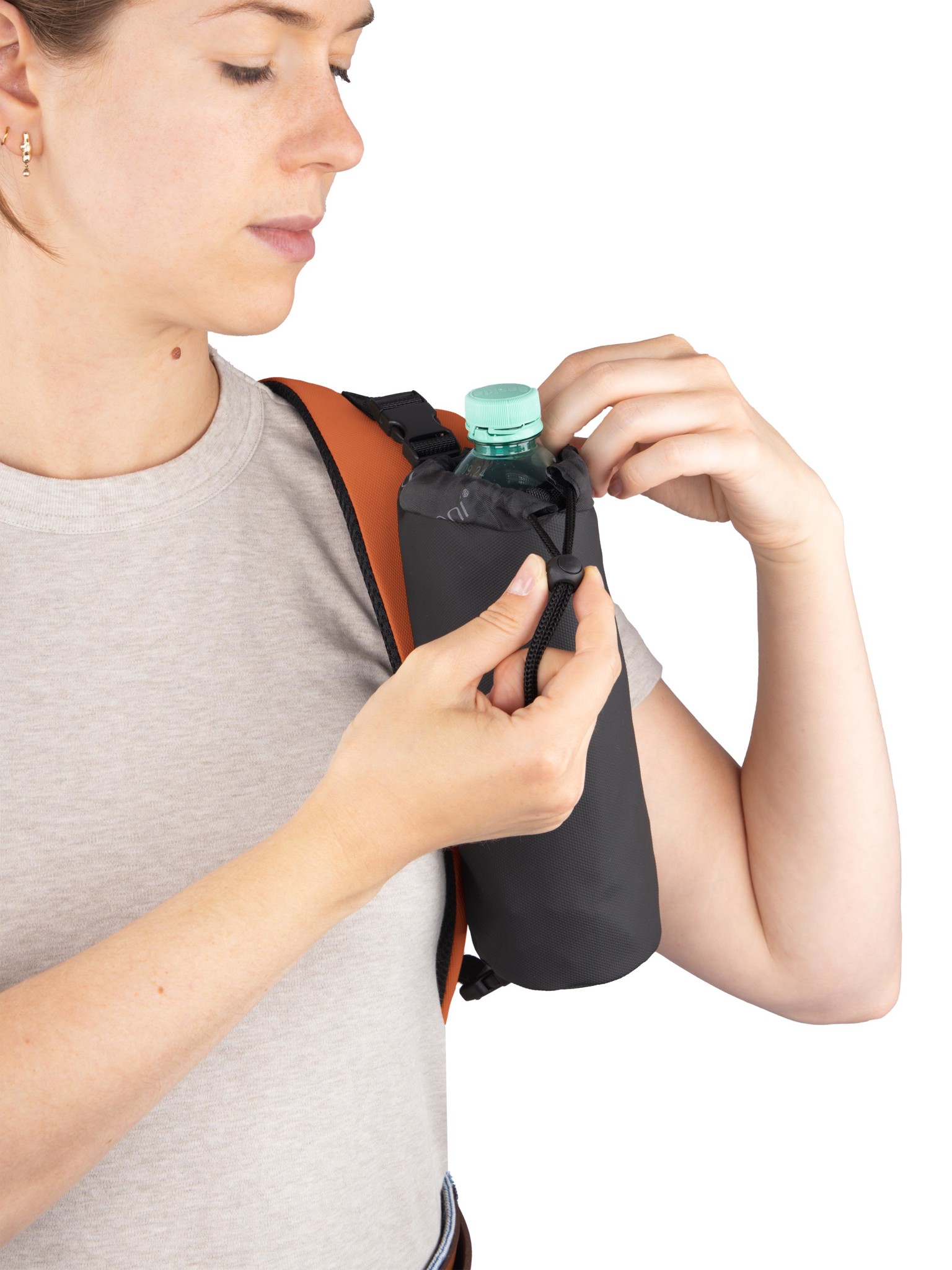 Mit einem verstellbaren Gurt lässt sich die "Nomi" Flaschentasche bequem auf der Brust oder Schulter tragen. Noch besser: Du kannst sie direkt am Schultergurt deines Nikaho Rucksacks fixieren – für noch mehr Bewegungsfreiheit.