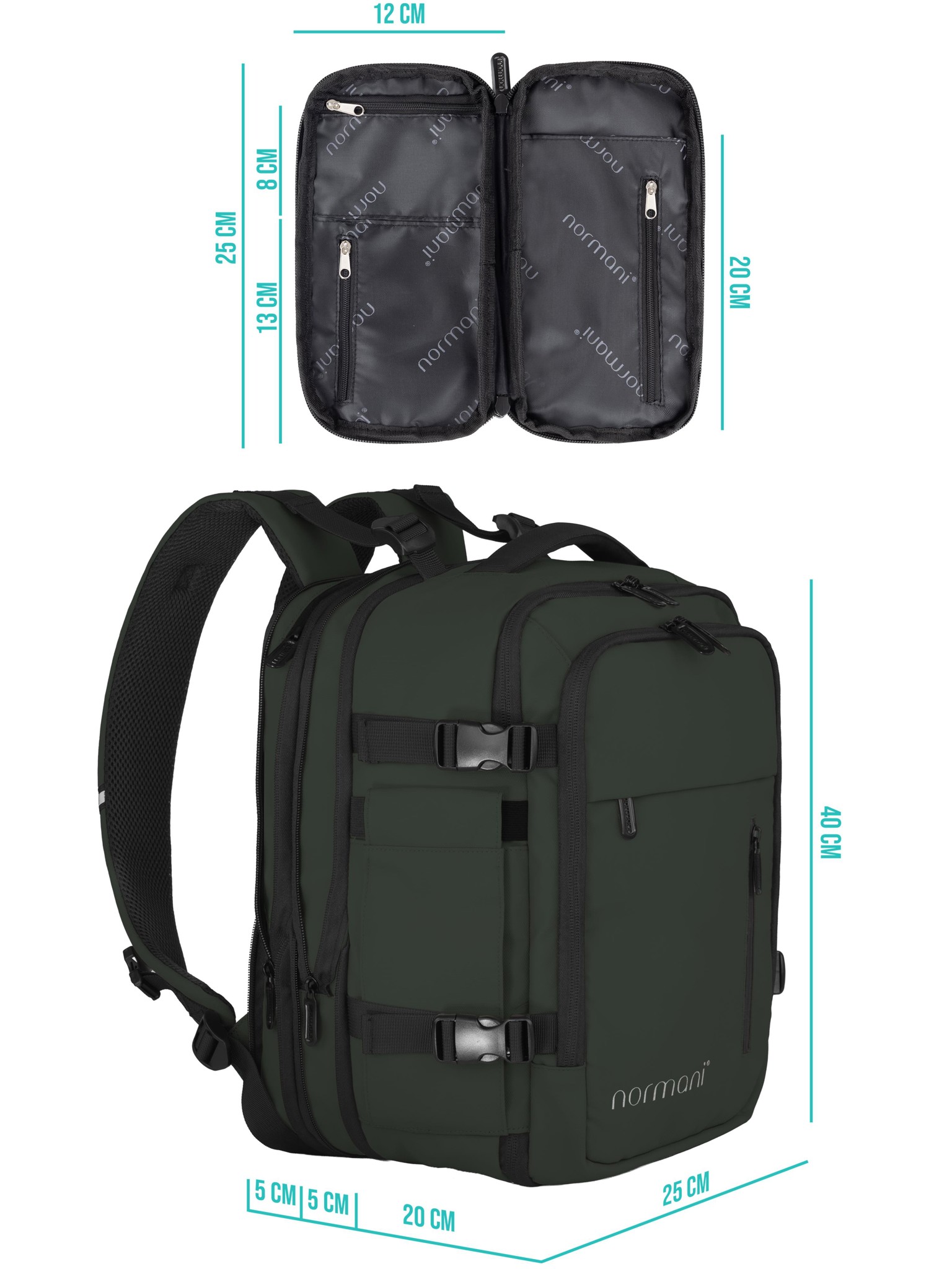 Ob Städtetrip oder spontaner Wochenendausflug – der normani Handgepäck-Reise-Rucksack Set ist dein cleverer Begleiter für grenzenlose Freiheit über den Wolken. Entwickelt für Vielreisende, die keinen Zentimeter Platz verschenken wollen, vereint er Funktionalität, Komfort und ein durchdachtes Design. Dank zweier clever integrierter Reißverschlüsse lässt sich das Maß von 40 x 25 x 20 cm um zwei mal 5 cm (und bis zu 10 Litern) erweitern – perfekt abgestimmt auf die Handgepäckvorgaben von Ryanair, Wizzair, Eurowings, KLM, Turkish Airlines, Lufthansa, Emirates und vielen weiteren Airlines.