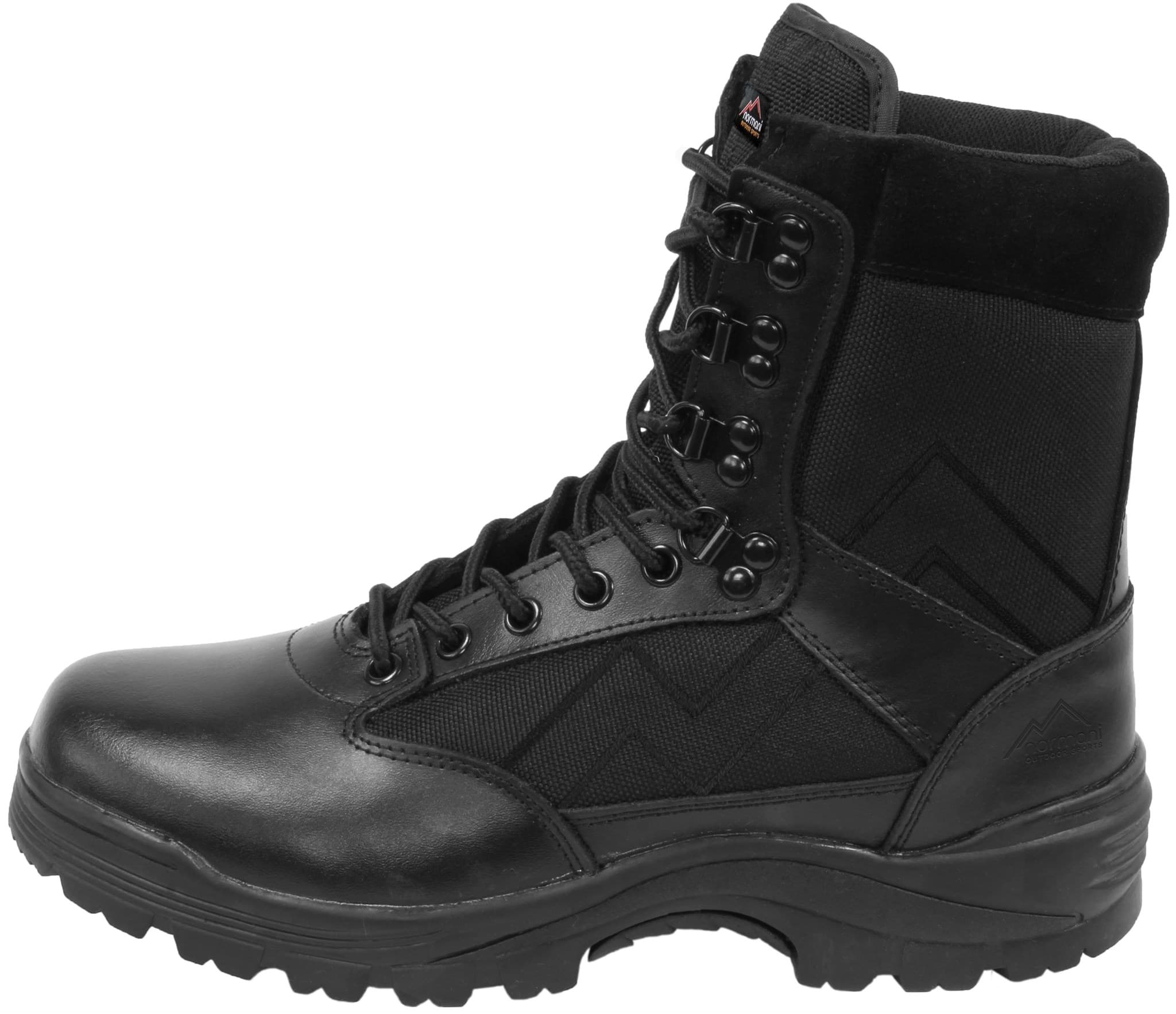Der robuste Einsatzstiefel „Delta“ steht für lange Haltbarkeit trotz Höchstleistungen und besteht aus einer Kombination von hochwertigem Echtleder und strapazierfähigem 1200 D Nylongewebe. Dadurch findet der Stiefel nicht nur den Einsatz im Security- oder im Polizeibereich, sondern eignet sich auch für lange Wanderungen als Outdoorstiefel oder im Freizeitbereich. Die Schuhe sind dank 4-Loch Haken und 5 Ösenschnürung schnell An- und wieder Ausgezogen und unterstützen den bestmöglichen Halt - auch in schwierigem Gelände. Die verstärkten Bereiche an Ferse und Fußspitze bieten zusätzliche Stabilität und Schutz für mehr Sicherheit. Die rutschhemmende Sohle ist grob profiliert und ermöglicht ein sicheres Auftreten auch auf nassem, unebenem Untergrund. Eine ausgeprägte, schneetaugliche Gummiprofilsohle. Zusätzlich ist die stoßdämpfende Außensohle nicht nur extrem rutschhemmend, sondern auch öl- und kraftstoffbeständig.