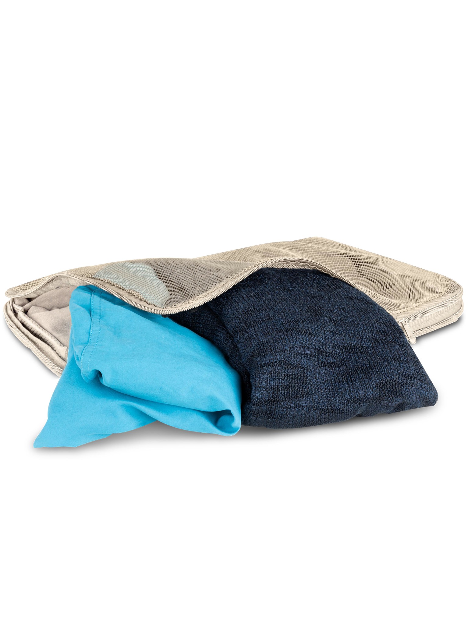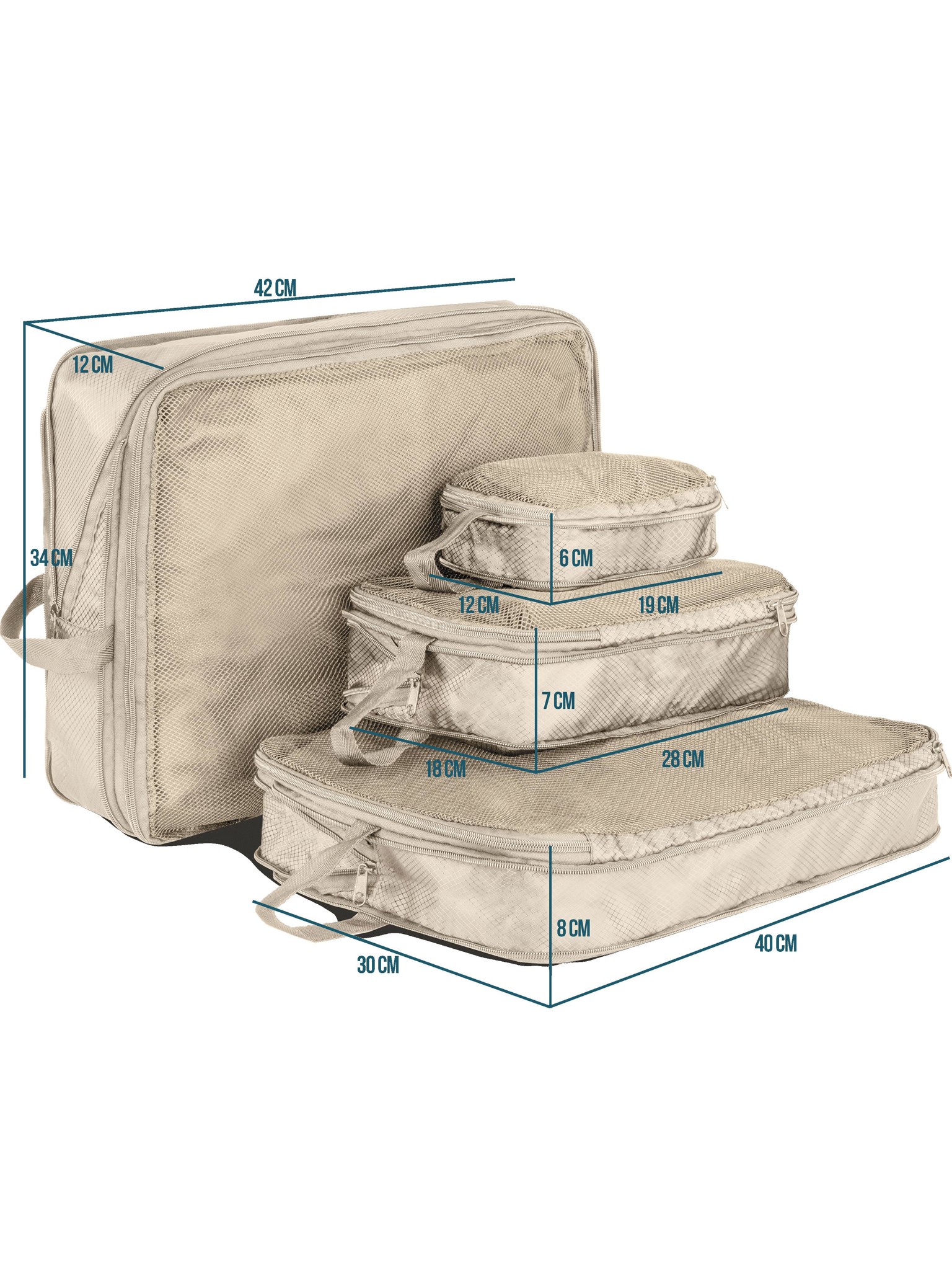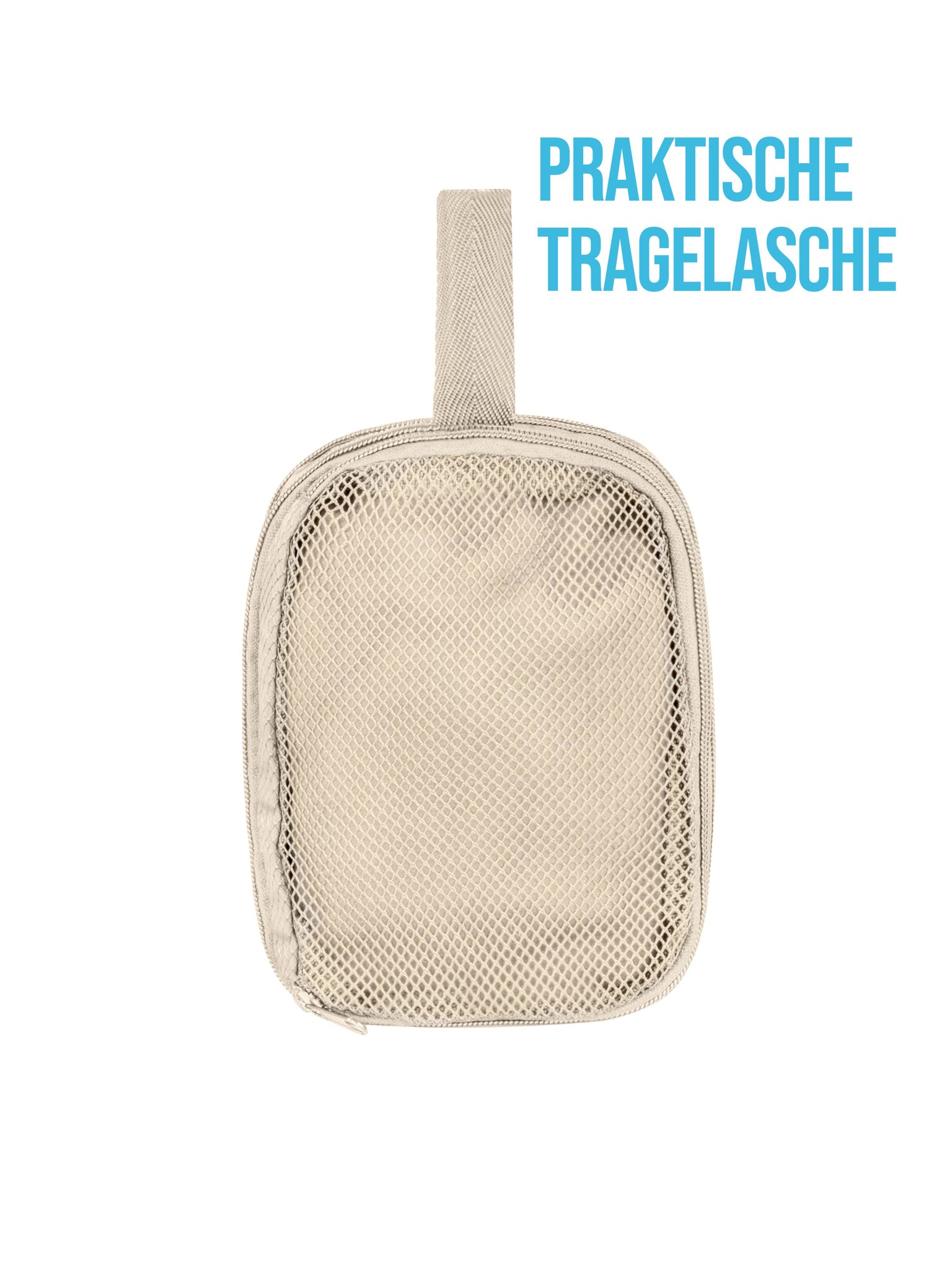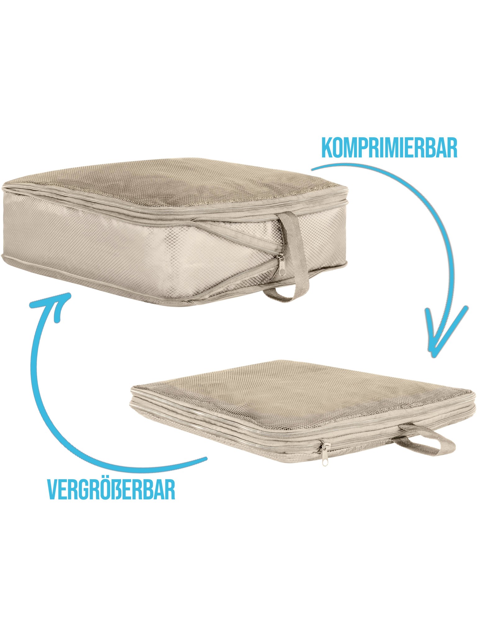 Das Kleidertaschen-Set von normani beinhaltet 4 Kleidertaschen. Die 4 Kleidertaschen können mit Pullis, Jacken, Hosen, T-Shirts, Handtüchern sowie Unterwäsche und Socken beladen werden. Durch die Mesh Einsätze hat man einen guten Überblick in welchem Beutel sich was befindet. Gleichzeitig ist das Material wasserabweisend und schützt damit die Unterseite des Beutels vor Feuchtigkeit und Nässe. Das Material sowie der Reißverschluss sind sehr robust. Ein praktischer Träger befindet sich an jeder Tasche, sodass diese auch in der Hand einfach transportiert werden kann. Das Eigengewicht der Taschen ist sehr gering. Zusätzlich verfügt die Tasche über eine Dehnfalte, welche mit hilfe eines Reißverschlusses vergößert oder verringert werden kann. Die Höhen der Tasche können somit bei befülltem Zustand verringert werden und ebenso das Volumen - Für bis zu 25 % mehr Platz in ihrer Reisetasche.
