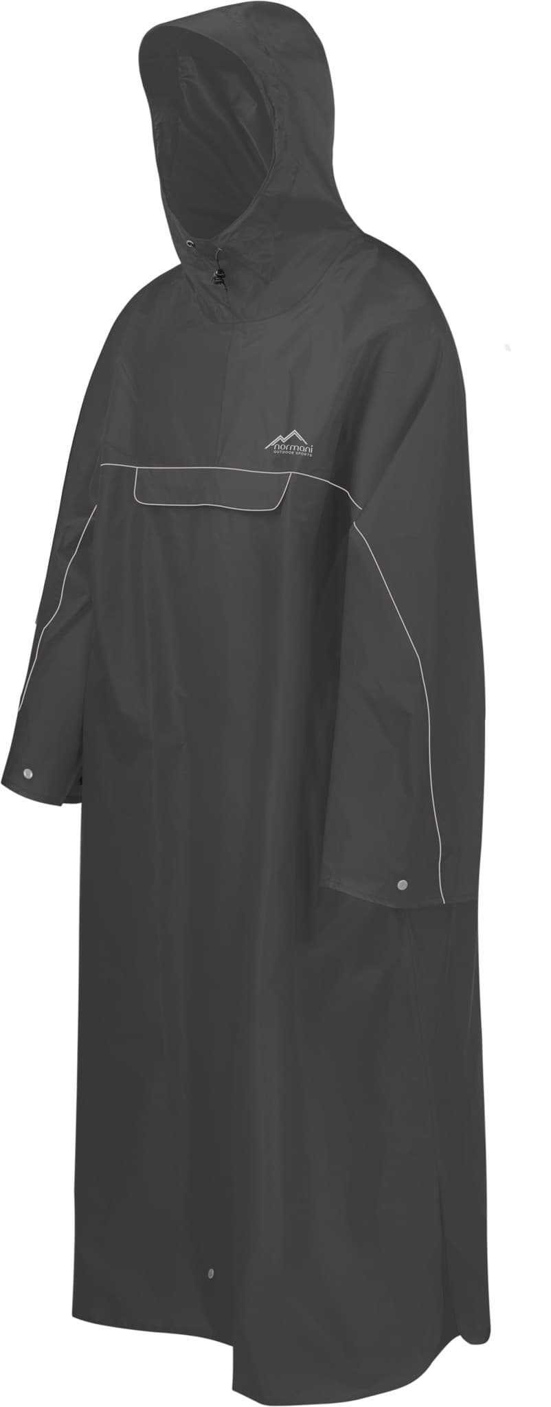 Der Regenponcho „Tutunendo“ schließt den Kreis unserer Regenponchofamilie. Auf einer geplanten Tagestour von 15 Kilometern zur nächsten Berghütte, lässt sich die Dauer anhand Beschaffenheit, Länge, Anstrengungsgrad und Erfahrungen einplanen, doch das Wetter wird davon nicht beeinflusst. Viele Poncho-Modelle bieten für einen sperrigen Wanderrucksack über der 80 Liter Marke nicht den ausreichenden Stauraum. Nun lässt sich das Volumen des Capes durch den Reißverschluss am Rücken erweitern, sodass es nicht nur Sie, sondern auch den Rucksack vor Regen und Nässe schützt. Die Kapuze mit steifem Schirm, ein hoch geschnittener Halsbereich, Klettstreifen zur Volumenregulierung der Kapuze sowie ein Kordelzug mit Stopper schützen den gesamten Kopf vor Wind und Wetter. Ein elastisches, umschnallbares Hüftband lässt den Poncho individuell und passgenau am den Körper befestigen. Die Druckknöpfe auf Vorder- und Rückseite lassen den Poncho zusätzlich zwischen den Beinen fixieren und schließen. Beidseitige 3M™ Scotchlite™ Reflective Reflektorstreifen verbessern die Sicherheit im Straßenverkehr und erleichtern das frühzeitige Erkennen bei Dämmerung.
