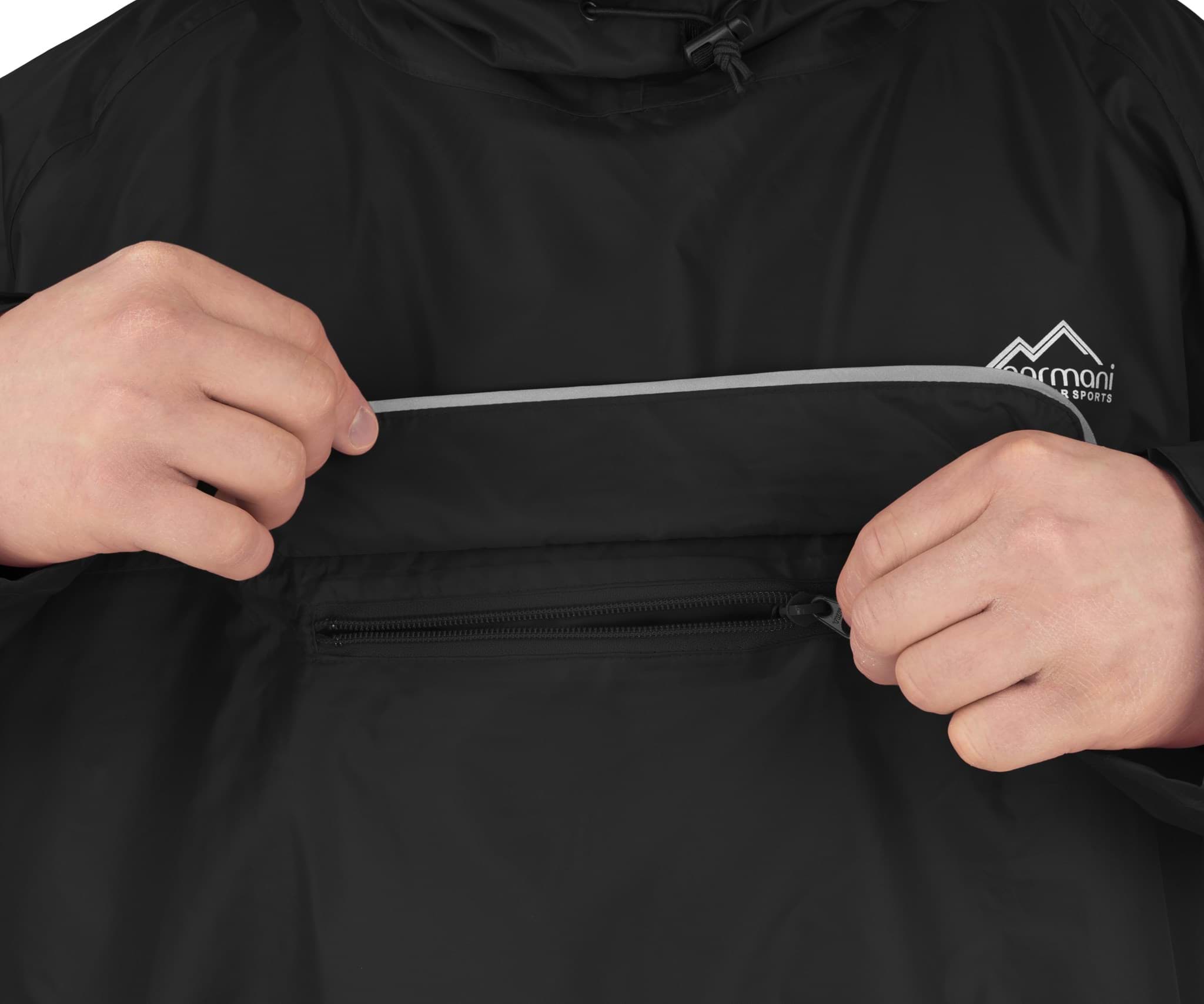 Der Regenponcho „Tutunendo“ schließt den Kreis unserer Regenponchofamilie. Auf einer geplanten Tagestour von 15 Kilometern zur nächsten Berghütte, lässt sich die Dauer anhand Beschaffenheit, Länge, Anstrengungsgrad und Erfahrungen einplanen, doch das Wetter wird davon nicht beeinflusst. Viele Poncho-Modelle bieten für einen sperrigen Wanderrucksack über der 80 Liter Marke nicht den ausreichenden Stauraum. Nun lässt sich das Volumen des Capes durch den Reißverschluss am Rücken erweitern, sodass es nicht nur Sie, sondern auch den Rucksack vor Regen und Nässe schützt. Die Kapuze mit steifem Schirm, ein hoch geschnittener Halsbereich, Klettstreifen zur Volumenregulierung der Kapuze sowie ein Kordelzug mit Stopper schützen den gesamten Kopf vor Wind und Wetter. Ein elastisches, umschnallbares Hüftband lässt den Poncho individuell und passgenau am den Körper befestigen. Die Druckknöpfe auf Vorder- und Rückseite lassen den Poncho zusätzlich zwischen den Beinen fixieren und schließen. Beidseitige 3M™ Scotchlite™ Reflective Reflektorstreifen verbessern die Sicherheit im Straßenverkehr und erleichtern das frühzeitige Erkennen bei Dämmerung.