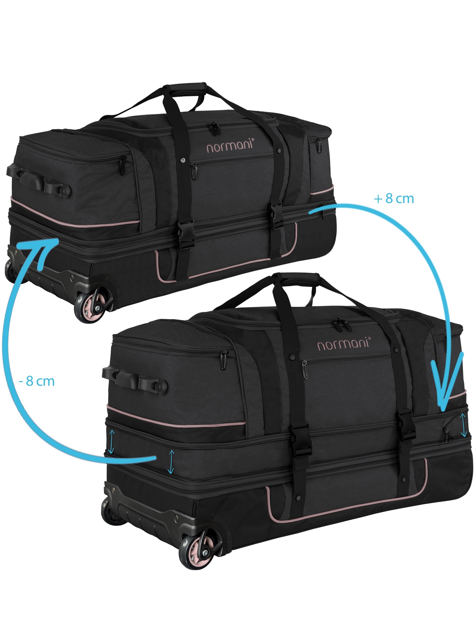 Leichte Handhabung: • Geringes Eigengewicht, leichtläufige Rollen und ausziehbarem Griff machen die Handhabung einfach und stressfrei. Clevere Fächerunterteilung: • Einen Pullover oder Jeanshose in der großen Reisetasche innerhalb von Sekunden finden? Die organisierte Raumaufteilung macht es möglich. Alles findet seinen Platz in einer der 5 verschiedenen Fächer. Das große Bodenfach mit zwei Kompressionsgurten, damit die Klamotten oder Schuhe an ihrem Platz bleiben, das Hauptfach, ein kleines Außenfach für Wertgegenstände, und die zwei Seitentaschen. In der rechten Seitentasche befindet sich zusätzlich noch ein kleiner Fach mit Reißverschluss für Geld oder ähnliches. Design und Funktionalität: • Das Material ist extra strapazierfähig, kombiniert mit den 2 Kunststoffschienen an der Unterseite der Tasche wird diese maximal stabilisiert, sodass die Reisetasche eine 12 stündige Flugreise locker wegsteckt. Die 2-Wege-Reißverschlüsse bei den Hauptfächern versprechen ein einfaches Öffnen und Schließen. Das Obermaterial ist Polyvinylchlorid (PVC) beschichtet, um den Inhalt gegen Nässe und Feuchtigkeit zu schützen.