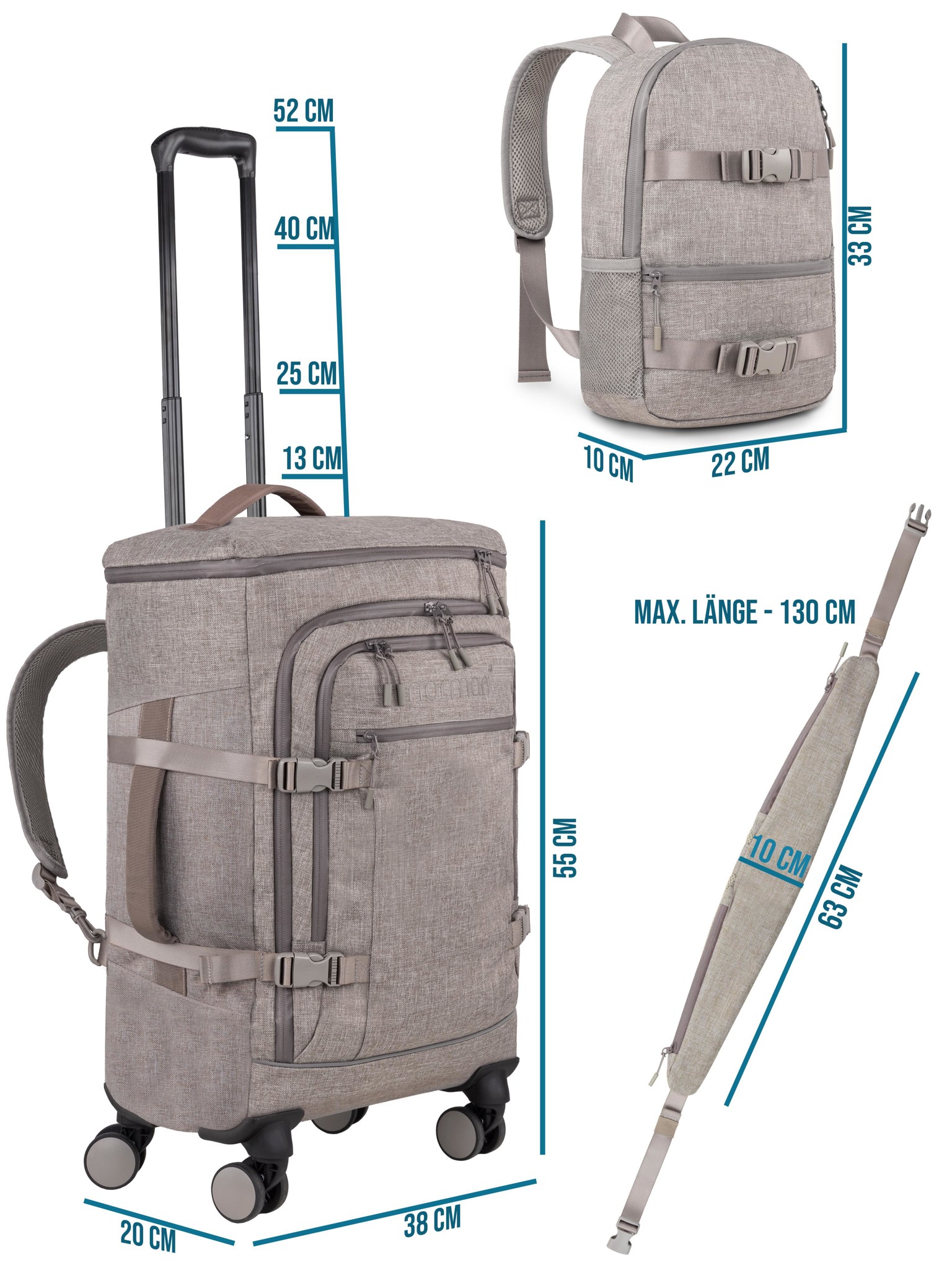 Auf Reisen oder unterwegs ist es praktisch einen Rucksack mit zwei Handgriffen in einen Trolley zu verwandeln. Für noch mehr Freiheit und einen entspannten Urlaub erfüllt dieser Trolleyrucksack die Standard Kabinenmaße 55 x 38 x 20 cm vieler Fluggesellschaften.