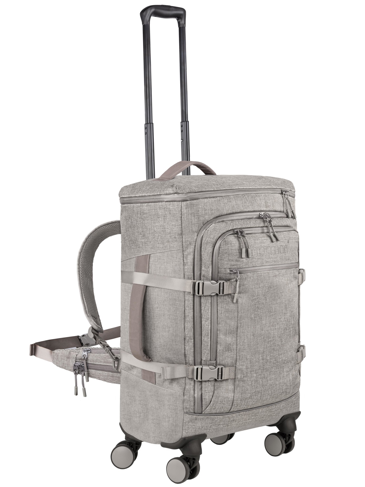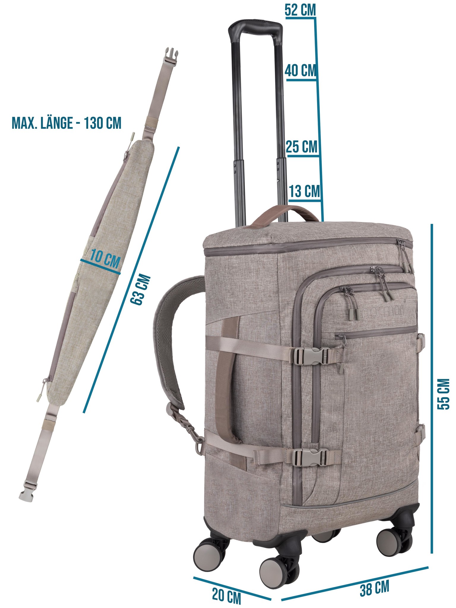 Auf Reisen oder unterwegs ist es praktisch einen Rucksack mit zwei Handgriffen in einen Trolley zu verwandeln. Für noch mehr Freiheit und einen entspannten Urlaub erfüllt dieser Trolleyrucksack die Standard Kabinenmaße 55 x 38 x 20 cm vieler Fluggesellschaften.