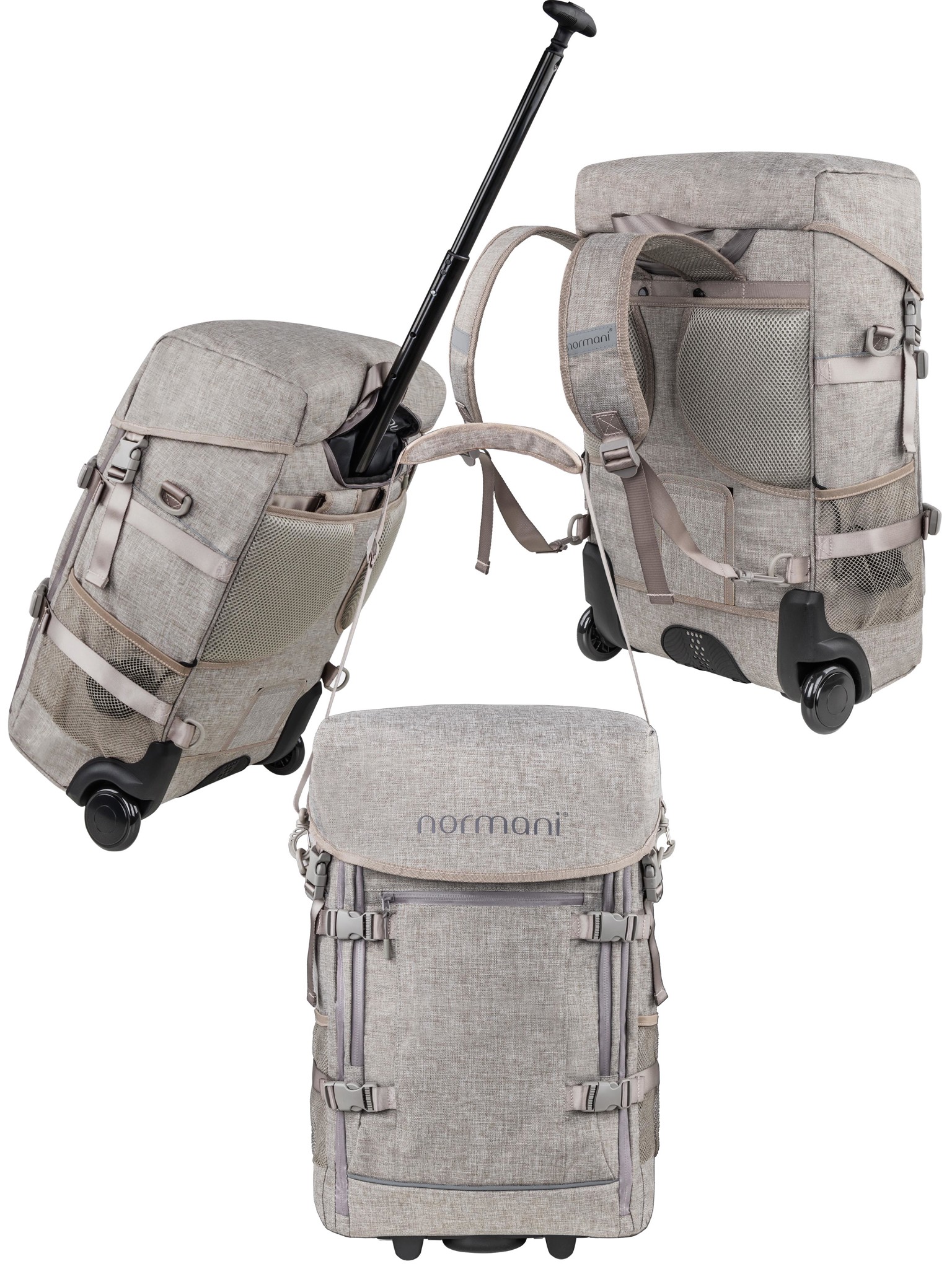 • Großes Hauptfach mit gepolstertem Laptopfach (Maße: 32 x 38 cm). • Aufgesetztes Fach (30 x 39 cm) mit wasserdichtem Zwei-Wege Reißverschluss für alles was schnell verstaut und erreicht werden muss. • Kleines aufgesetztes Fach (23 x 29 cm) mit wasserdichtem Reißverschluss für Handy Portemonnaier und vieles mehr. • Wer das Maximum des Volumens der Tasche ausnutzen will, kann die seitlichen Netztaschen nutzen um Flasche, Regenschirm oder ähnliches zu verstauen. • Für die maximale Stbilität des Trolleys ist dieser mit einer harten Unterplatte ausgesattet, sodass dieser selbst ohne Beladung gerade steht und nicht umfällt. • Die Kompressionsriemen mit Clipverschluss bilden das Verbindungsstück der zwei Rücksäcke. Einfach aneinanderbefestigen, sodass beide Rucksäcke auf dem Rücken getragen werden können. Darüber hinaus entlasten die Kompressionsriemen die Reißverschlüsse und können zusätzlich eine Jacke oder Gegenstände mit Karabiner oder Klettverschluss halten. • Die Rollen können mit einem Bezug abgedeckt werden, die Abdeckung kann bei Nichtnutzung in den Seitenfächern verstaut werden.