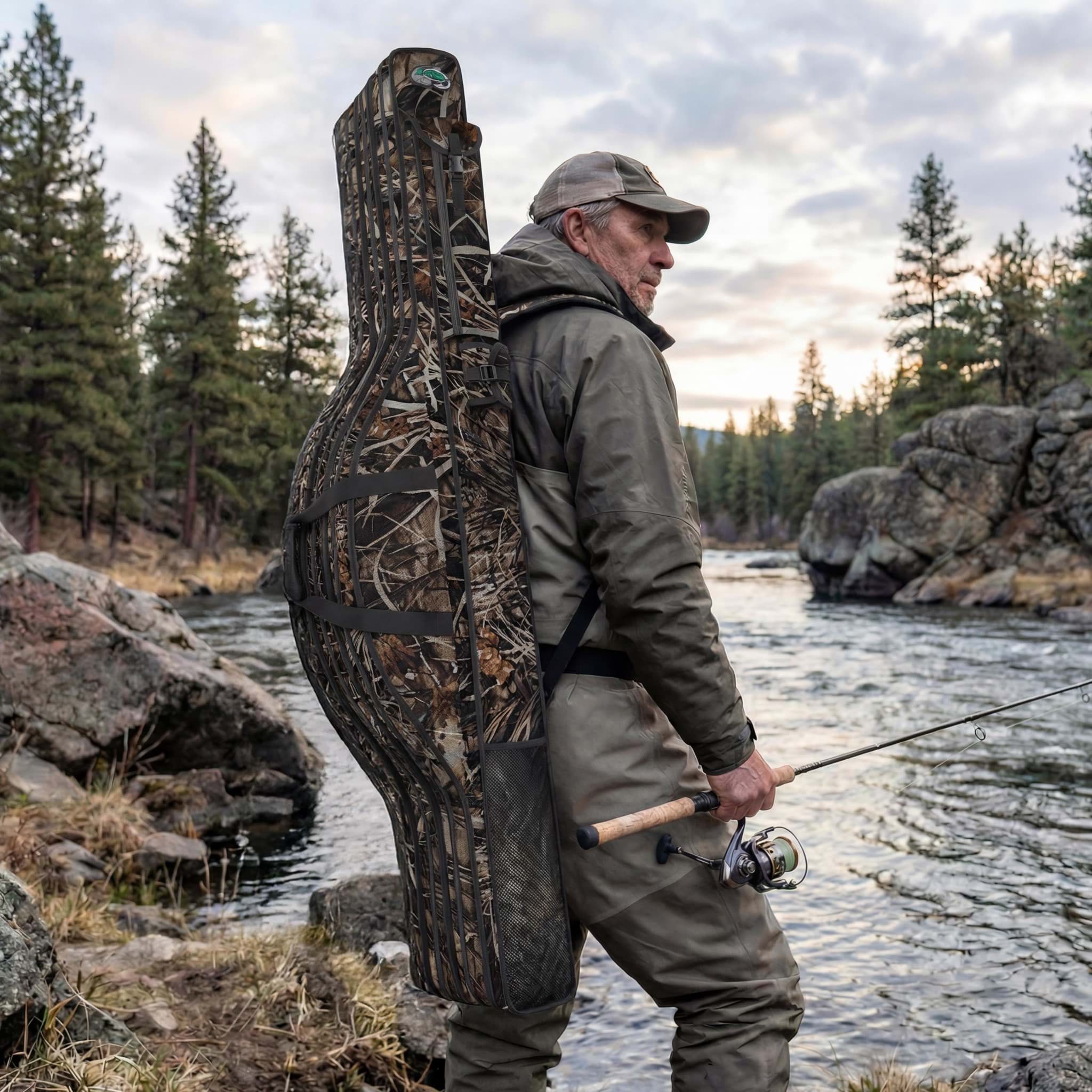 Für maximalen Tragekomfort ist die Rutentasche mit gepolsterten Rucksacktragegurten ausgestattet, die ein bequemes Transportieren auch über längere Strecken ermöglichen. Zusätzlich sorgen zwei stabile Tragegriffe mit Klettverschluss-Fixierung für einfaches Handling beim Ein- und Ausladen. Die durchdachte Gewichtsverteilung unterstützt einen angenehmen Sitz auf dem Rücken und macht die Tasche zum idealen Begleiter für Ansitz- und Karpfenangler, ebenso wie für mobile Spinnangler.