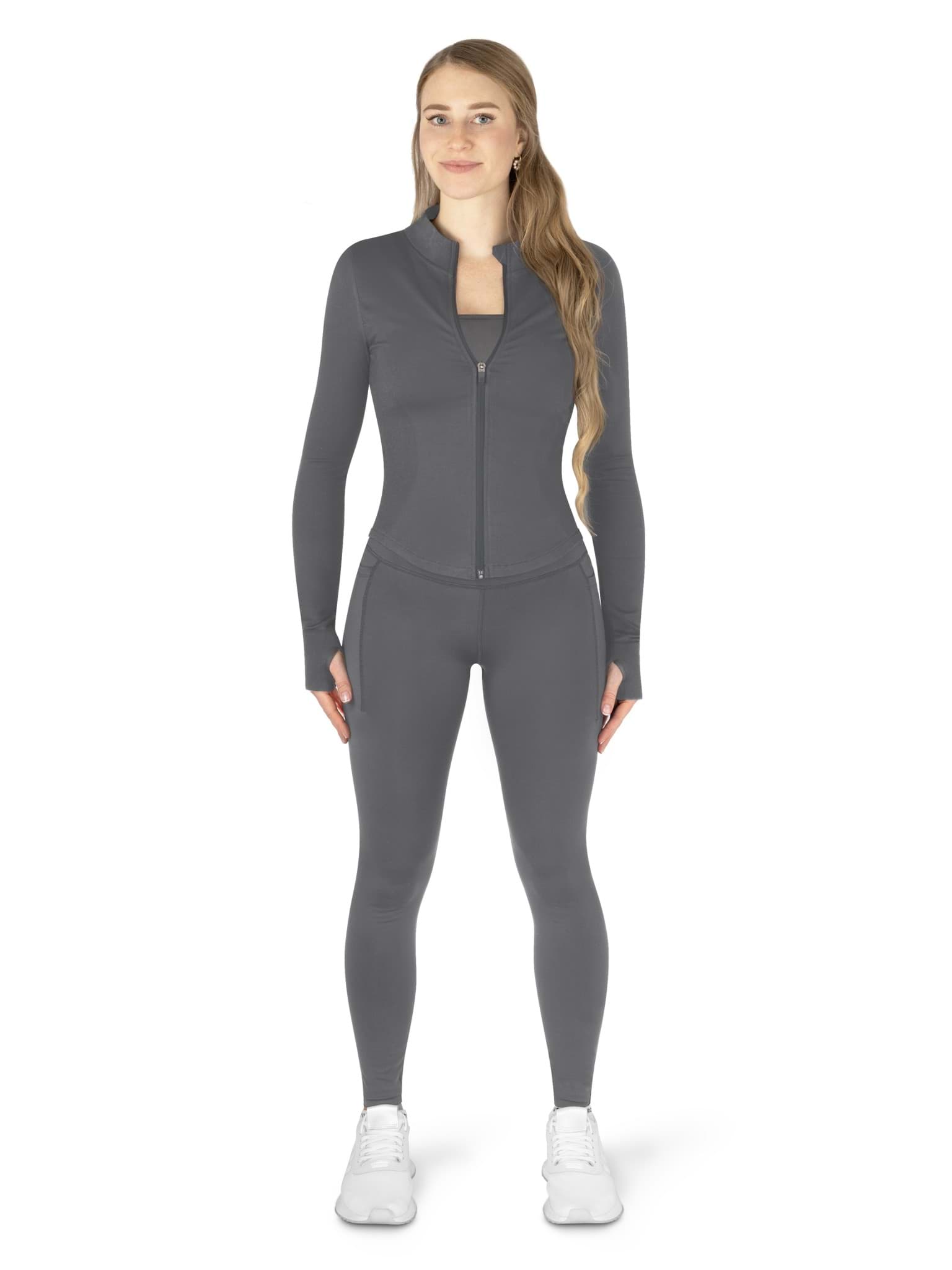 Die Zipper-Jacke ergänzt das Set ideal: figurbetont, elastisch und perfekt zum Aufwärmen oder als sportlicher Layer im Alltag. Alle Teile sind atmungsaktiv, flexibel und angenehm zu tragen.