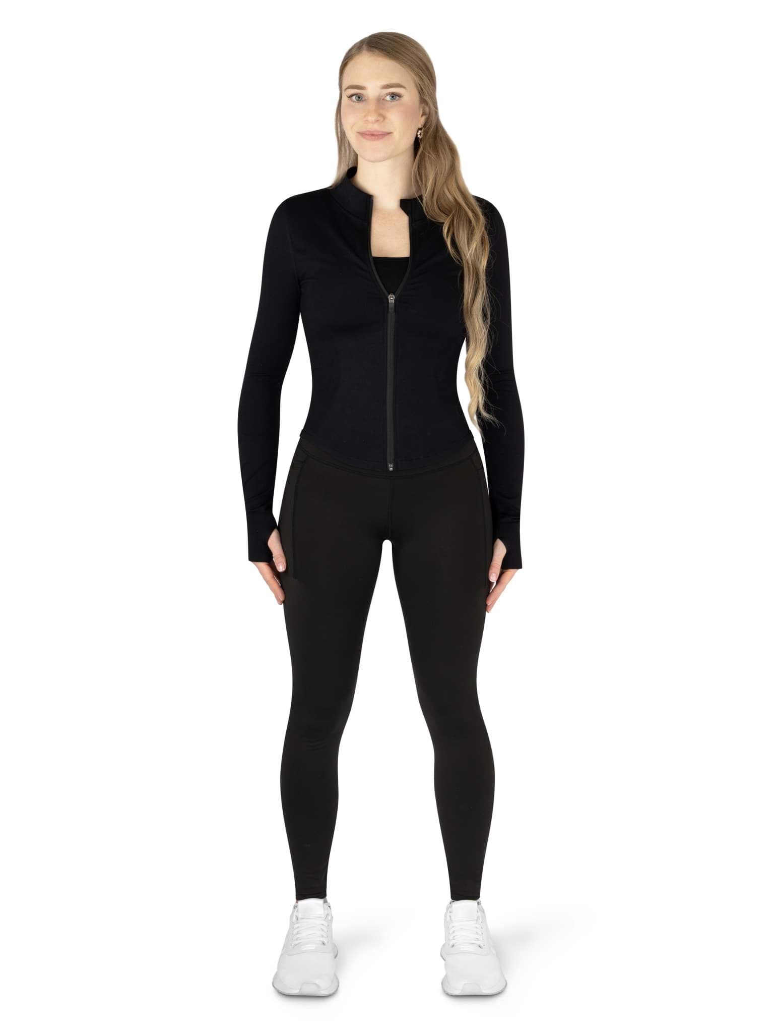 Die Zipper-Jacke ergänzt das Set ideal: figurbetont, elastisch und perfekt zum Aufwärmen oder als sportlicher Layer im Alltag. Alle Teile sind atmungsaktiv, flexibel und angenehm zu tragen.