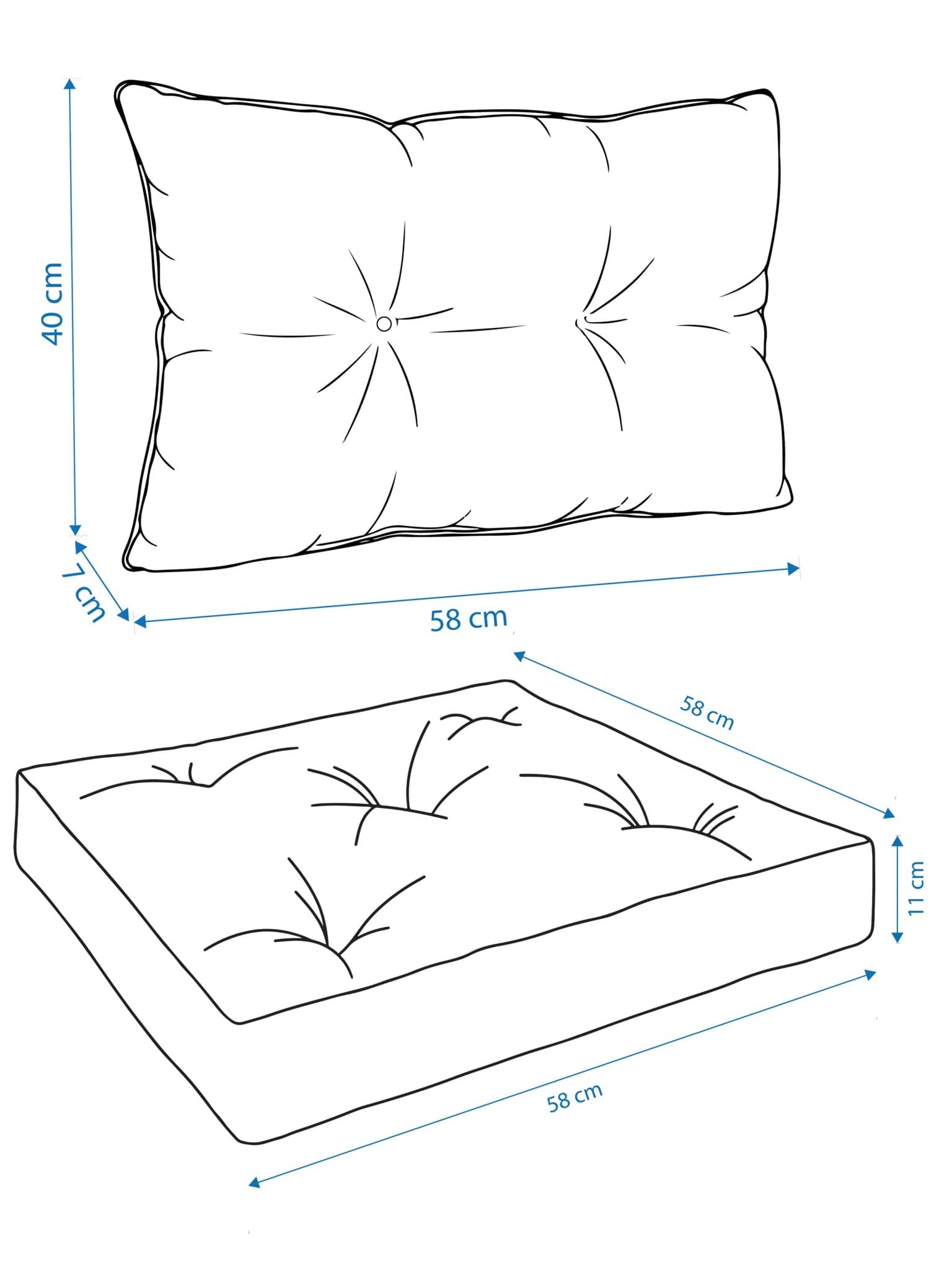 • 2-teiliges Lounge-Set: Sitzkissen + Rückenkissen • Sitzkissen 58x58x11 cm • Rückenkissen 58x40x7 cm • Extra dicker Sitzkomfort + ergonomische Rückenunterstützung • Ideal für Gartensofa und Palettenmöbel