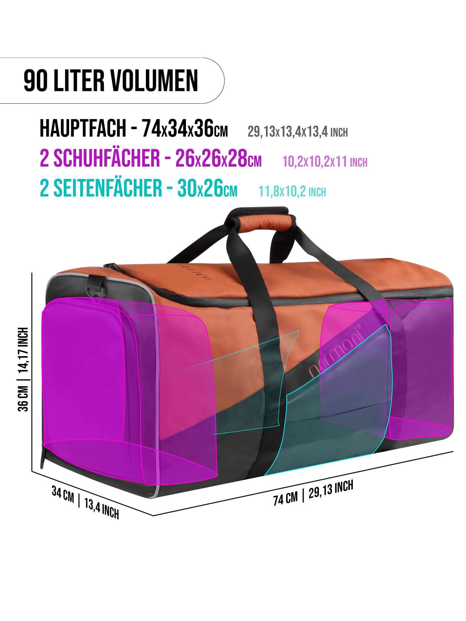 Unsere Tragetasche von normani mit 90 Liter Volumen kann ideal als Reisetasche oder Sporttasche genutzt werden. 5 Fächer bieten ideal Platz für alle Sachen. Das Hauptfach ist mit Hilfe eines 2-Wege-Reißverschlusses schnell und einfach zugänglich. Die zwei Seitenfächer sind optimal um Gegenstände separat zu verstauen. Schmutzwäsche oder nasse Handtücher getrennt unterbringen? - Kein Problem! Ein Seitenfach ist vergrößerbar, sodass dort kleine oder auch große Gegenstände verstaut werden können, ohne dass viel Platz vom Hauptfach abgezogen wird. Die zwei flachen Außenfächer sind optimal für Portemonnaie, Handy oder Schlüssel. PackMate Funktion: Die Tasche ist mit einem Hüftgurt welcher an der Rückseite befestigt werden kann erweiterbar - für ein bequemes und einfaches Tragen auf langen Strecken.