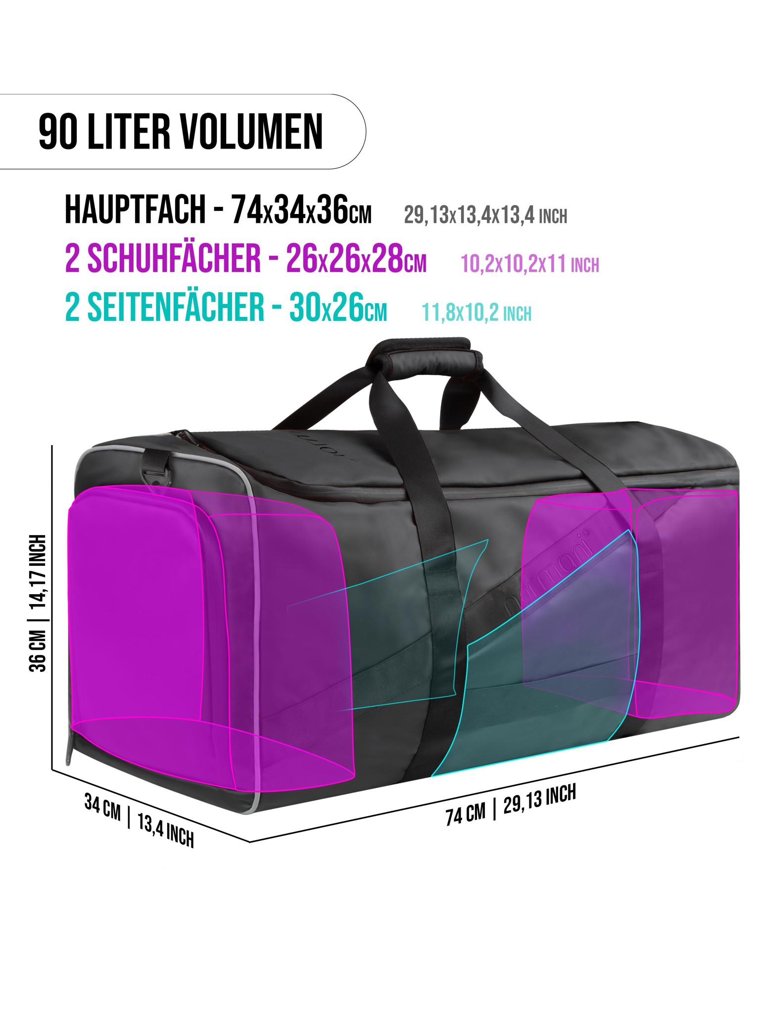 Unsere Tragetasche von normani mit 90 Liter Volumen kann ideal als Reisetasche oder Sporttasche genutzt werden. 5 Fächer bieten ideal Platz für alle Sachen. Das Hauptfach ist mit Hilfe eines 2-Wege-Reißverschlusses schnell und einfach zugänglich. Die zwei Seitenfächer sind optimal um Gegenstände separat zu verstauen. Schmutzwäsche oder nasse Handtücher getrennt unterbringen? - Kein Problem! Ein Seitenfach ist vergrößerbar, sodass dort kleine oder auch große Gegenstände verstaut werden können, ohne dass viel Platz vom Hauptfach abgezogen wird. Die zwei flachen Außenfächer sind optimal für Portemonnaie, Handy oder Schlüssel. PackMate Funktion: Die Tasche ist mit einem Hüftgurt welcher an der Rückseite befestigt werden kann erweiterbar - für ein bequemes und einfaches Tragen auf langen Strecken.