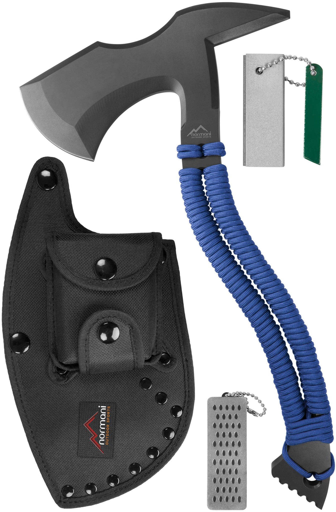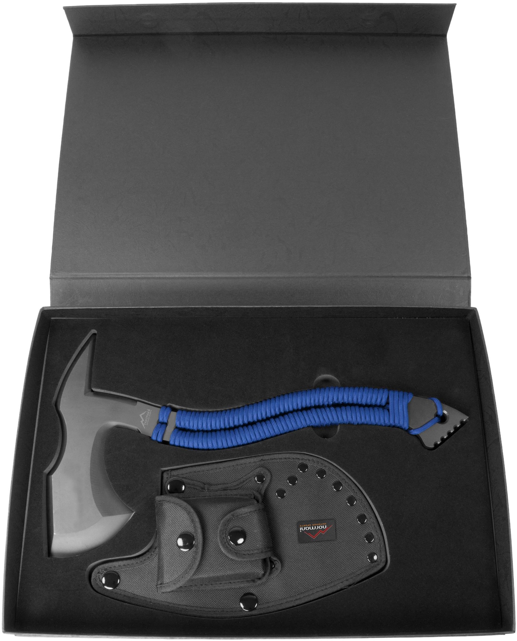 Der „Predator“ ist ein unverwüstlicher, hochwertiger Tomahawk. Klinge und Griffstück sind aus einem Stück 420er Stahl gefertigt. Das Griffstück ist vollflächig mit einem Nylonband umwickelt, wodurch der Tomahawk gut in der Hand liegt und eine Vielzahl verschiedener Greifmöglichkeiten zulässt. So kann die führende Hand für kontrollierte und präzise Schnittarbeiten weit nach oben am Axtkopf angesetzt werden. Für harte Schläge mit maximaler Durchschlagskraft sollte der Tomahawk am Griffende gefasst werden. Der Dorn am Klingenende ermöglicht tiefe, gezielte Schläge. Das Seil eignet sich optimal zum Befestigen von Ausrüstungsgegenständen oder für das Abseilen kleiner Lasten. Durch die unterschiedlich angeordneten Gürtelschlaufen an der Scheidenrückseite lässt sich diese sowohl längs als auch quer befestigen. In der abnehmbaren Tasche auf der Scheide befinden sich Schleifstein und Feuerstarter, der in der Wildnis bei einsetzender Dämmerung von großer Bedeutung sein kann. Die Lieferung erfolgt in einer gepolsterten Aufbewahrungsbox.