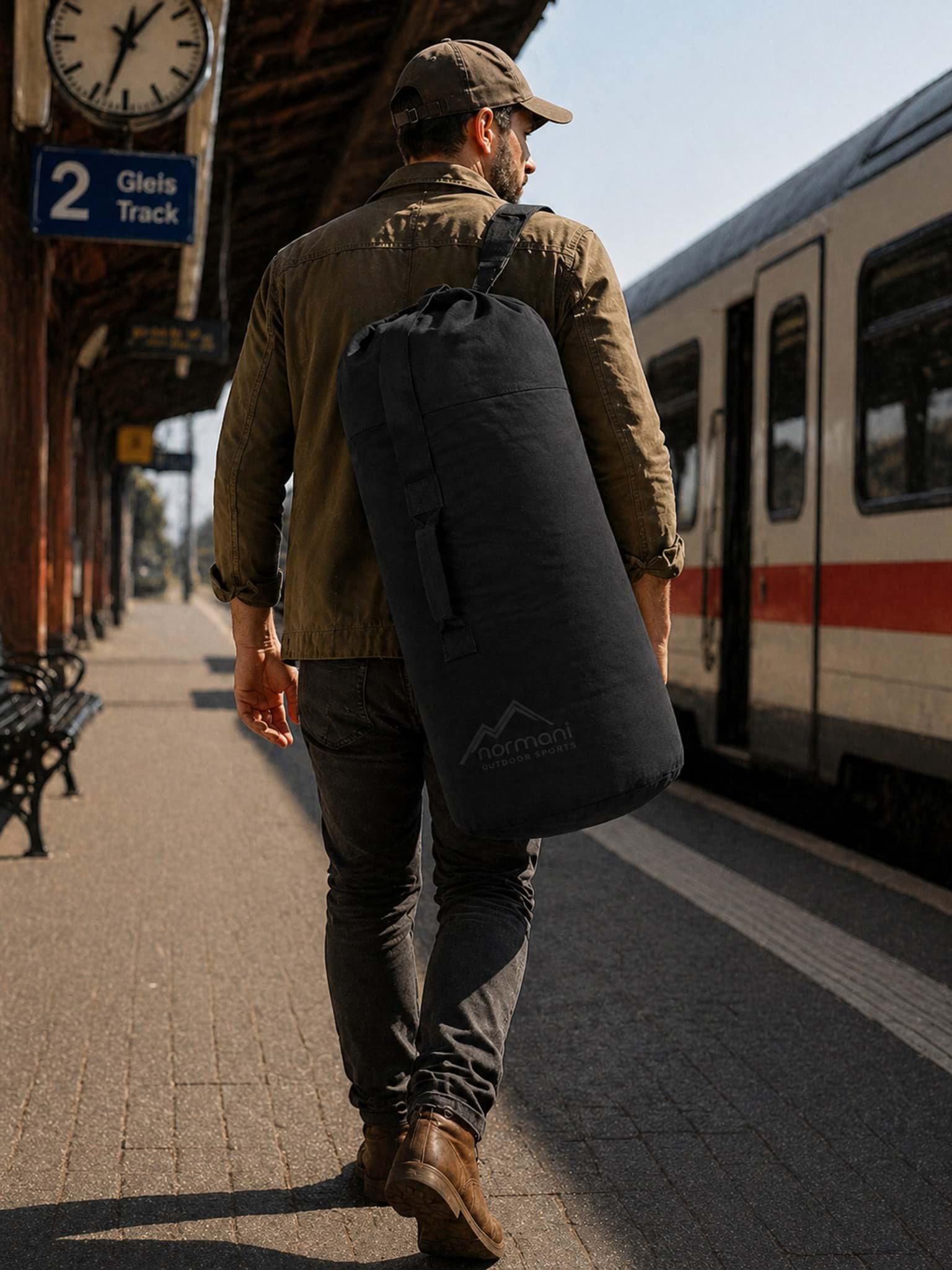 Er bietet mit 100 Litern ausreichend Strauraum und kann in der Freizeit, bei einer längeren Wandertour, oder einem Wochenendurlaub benutzt werden. Der stabile Tragegurt bietet optimalen Tragekomfort. Der traditionelle Seesackverschluss besitzt 4 Ösen, die übereinander gelegt und dann mit einem Karabiner sicher verschlossen werden. Der Seesack eignet sich dank des zeitlosen Designs auch optimal zum Sport oder fürs Einkaufen. Durch das hohe Packvolumen lassen sich unkompliziert größere Mengen verstauen und transportieren.
