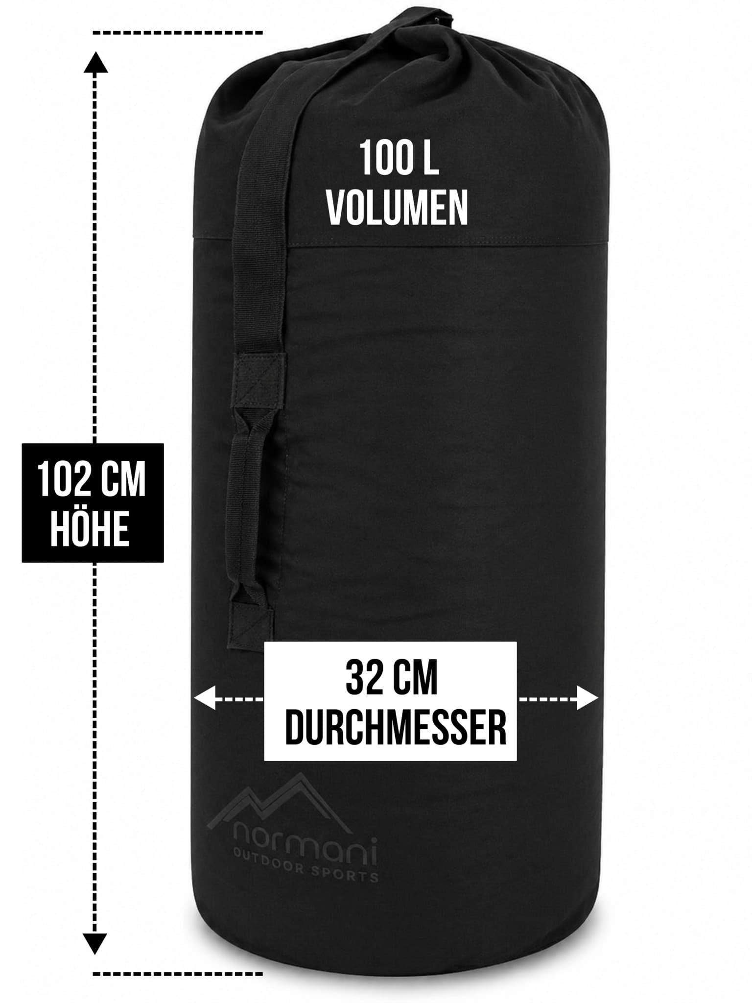 • Klassischer Seesack 100 Liter • Großes Fassungsvermögen • Baumwollgewebe in reißfester Canvas-Qualität • Verschluss mit 4 Metall-Rundösen und Karabiner • Stabiler Trageriemen seitlich